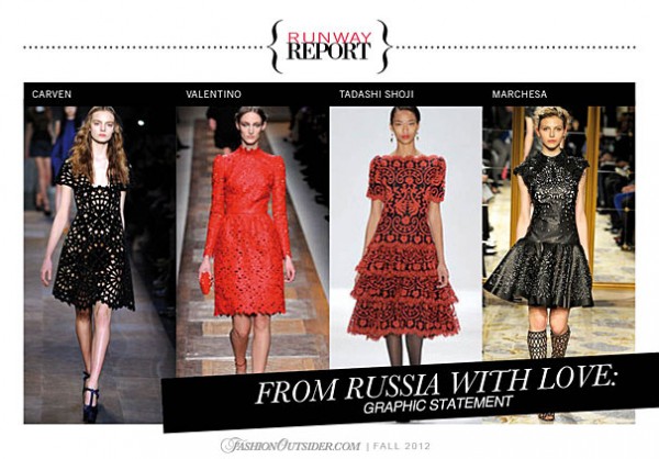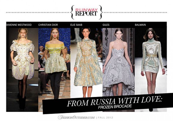 A soft breath of fresh, cool air, From Russia with Love is pristine pretty with an icy strength. Dominated by brocade and lace, this trend is inspired by the delicate dominance of the Romanov empire, traditional russian dress and the Russian Ballet. The trend is a dance between a traditional feminine aesthetic and a distanced, cold strength through various renditions of cream in delicate fabrications, stiff brocades and kitch florals with pops of black and passionate poppy red.
