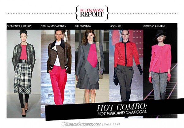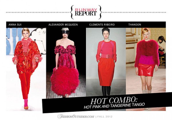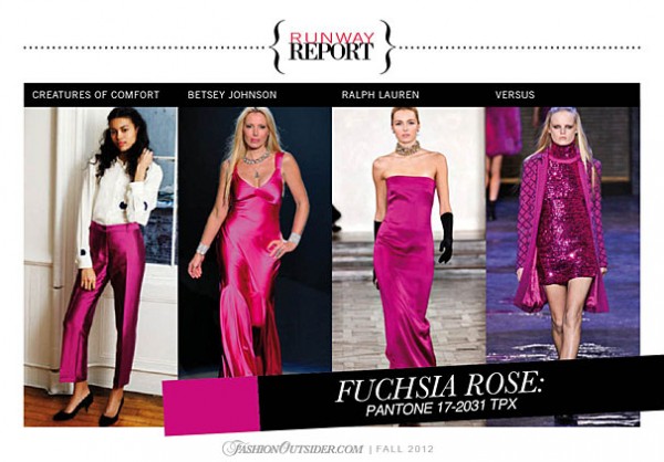 Hot pinks were all over the runways this fall, notably Pantone’s Pink Flambé. A bright hue that adds pop and personality to blacks and greys while perfectly complimenting Pantone’s colour of the year, Tangerine Tango. Though not included in Pantone’s Fall 2012 colour report, Fuchsia Rose and Azalea also deserve mention as daring alternatives to Pink Flambé.